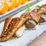 Indulge in our Dragon Roll, featuring tempura shrimp and cucumber inside, topped with sliced avocado, eel sauce, and sesame seeds, creating a visually stunning and delicious roll.